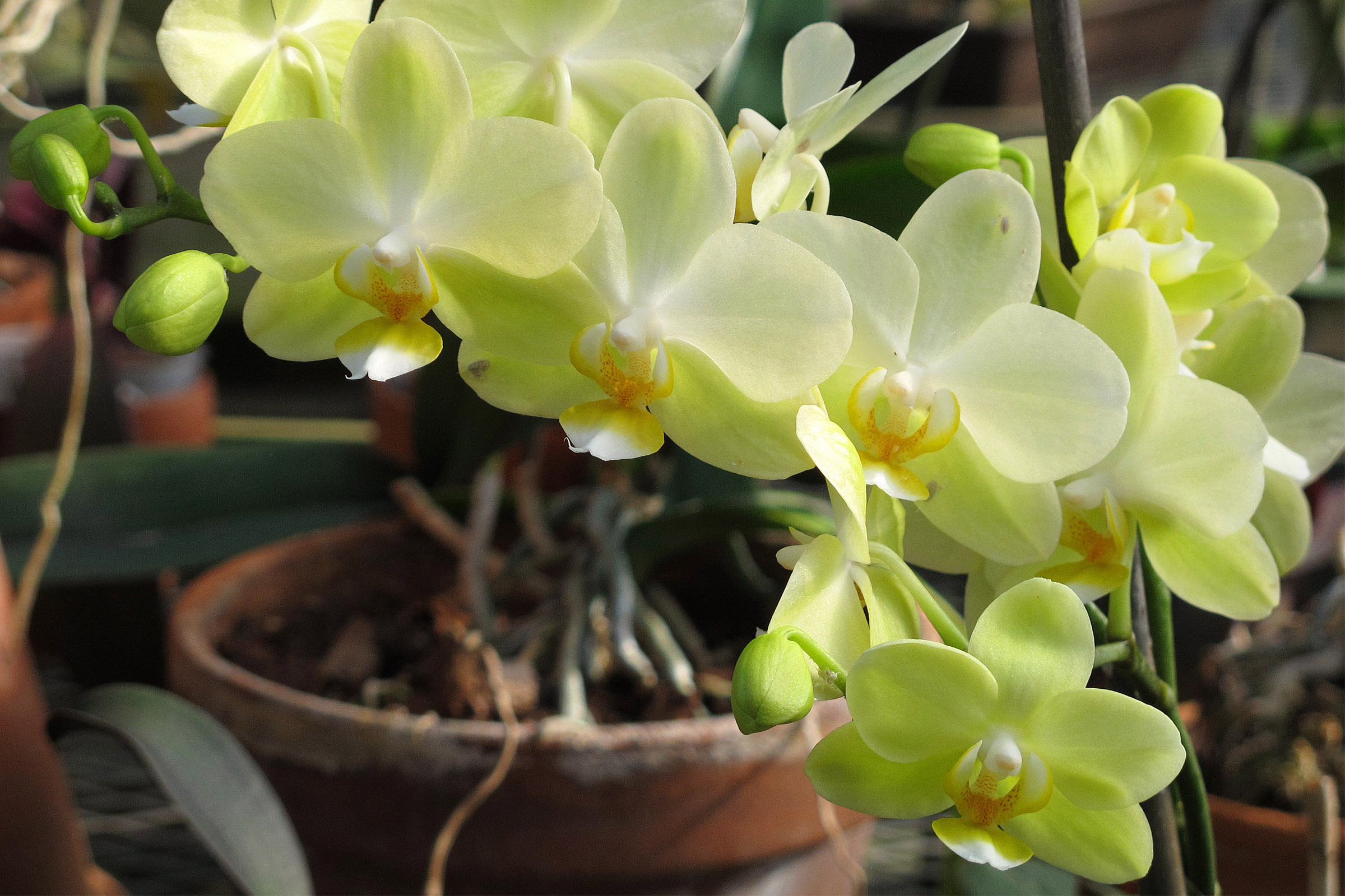 Algumas pessoas apontam o vaso de plástico como o ideal para as Phalaenopsis, mas tenho as minhas em vasos de barro e estão bem, florescendo todo ano.